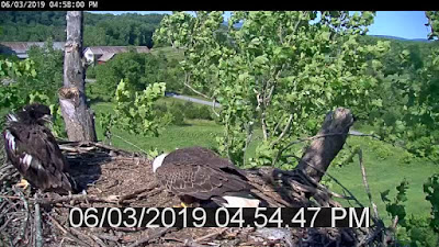 843 Fish 🐟delivered and claimed so Shep left She did attempt self feed all over the nest she drug it from center of nest to stump and then to food pantry area at 4 over 25 min and still not done. That is what happens when you chase your parent away from the nest LOL A learning lesson