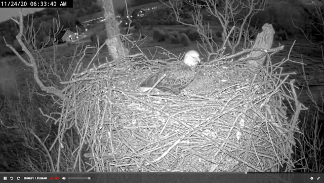 6:33 down from the attic to check the nest to see how many sticks they will need today