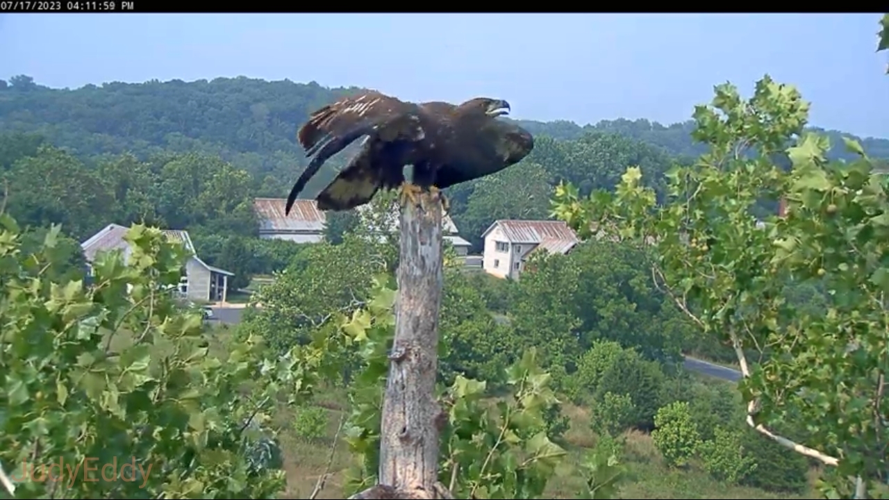 4:35 pm Bella flying across field toward nest, cam 1 4:36:01 pm Bella in, stick delivery . Scouts flying around the nest. Wings flapping ...