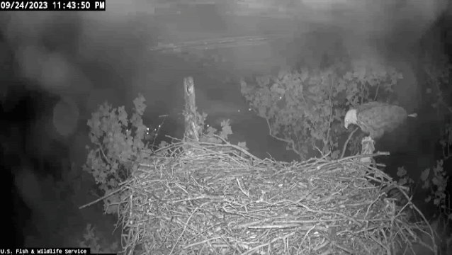 Evening comes and two Eagles 716 video I'm not knowing which to fly around the nest the one goes in the nest and you can hear whining coming out from under the nest. Or from the other one the one that landed in the nest does have black on its tail so what's going on for like 3 minutes nandawani stopped I didn't see any fly outs though they could have flew out the other way no drama please just cannot handle