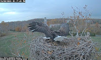 520 pm – After the young male leaves the nest he perches on a nearby limb. Bella sees him and vocalizes several times. 530 pm - The young male visits the man made platform, it sounded like he rearranged the furniture there. He leaves the tree at about 533 pm.