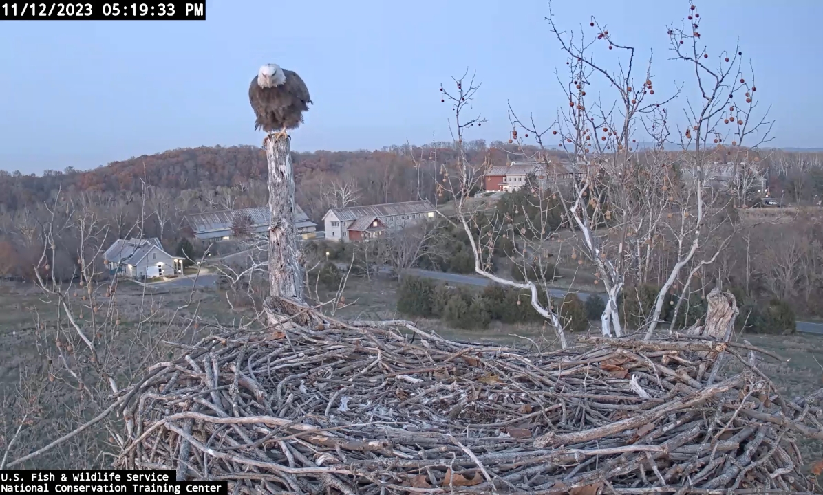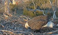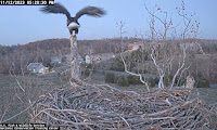 Not for sure what he brought to the nest it was white furry or feathery down feathers maybe but it did look very can't figure it out maybe a small rodent! Stayed for a long time arrived 9:19 left it 1008 almost an hour