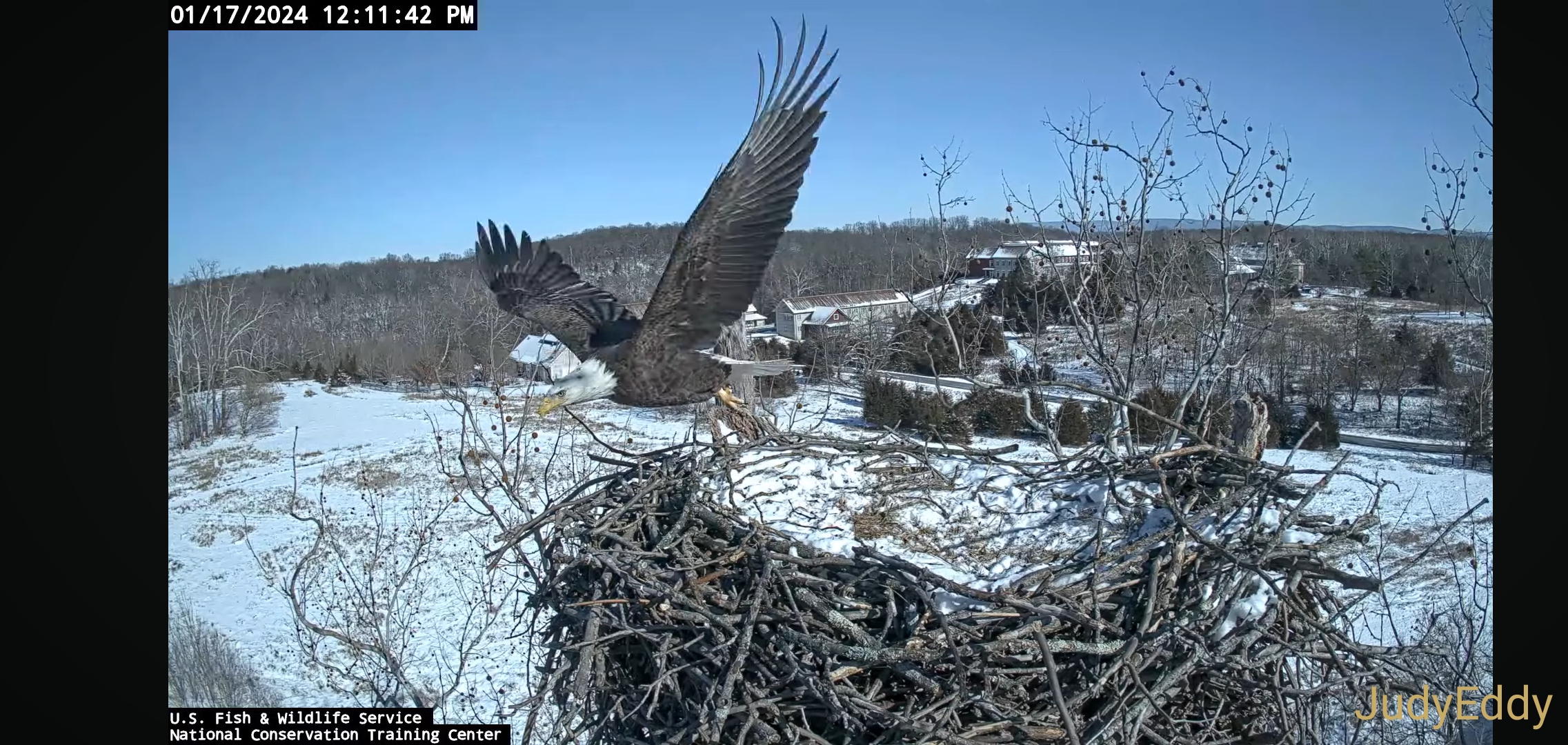 954 Scout brings in a large Branch he has issues placing it this so funny how they hop on it he breaks it and does manage to place it up to the Lop he goes. 1002 gone again. . 136 Scout back with another stick. 138 he takes off to 206 scout his back. Moving sticks around the nest is a mess. 219 scout leaves from the lop.