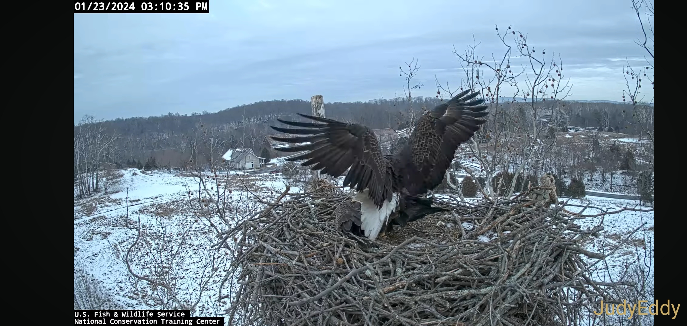 1151 eagle has landed in the nest 1152 second 1206 Scout almost got blown over. Tail up 1228 kisses both eating standing around looking ...