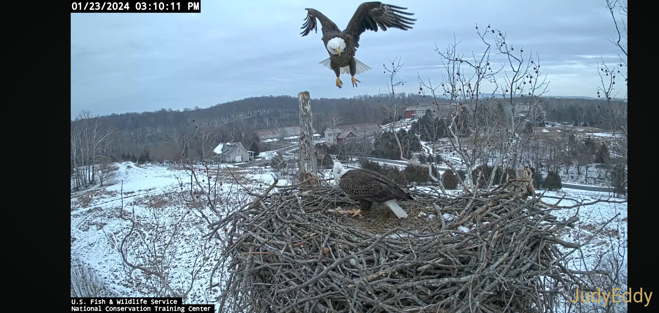 Mr eagle Scout came to the nest all by himself but with the big load of bedding or hay or straw whenever you want to call it places it...