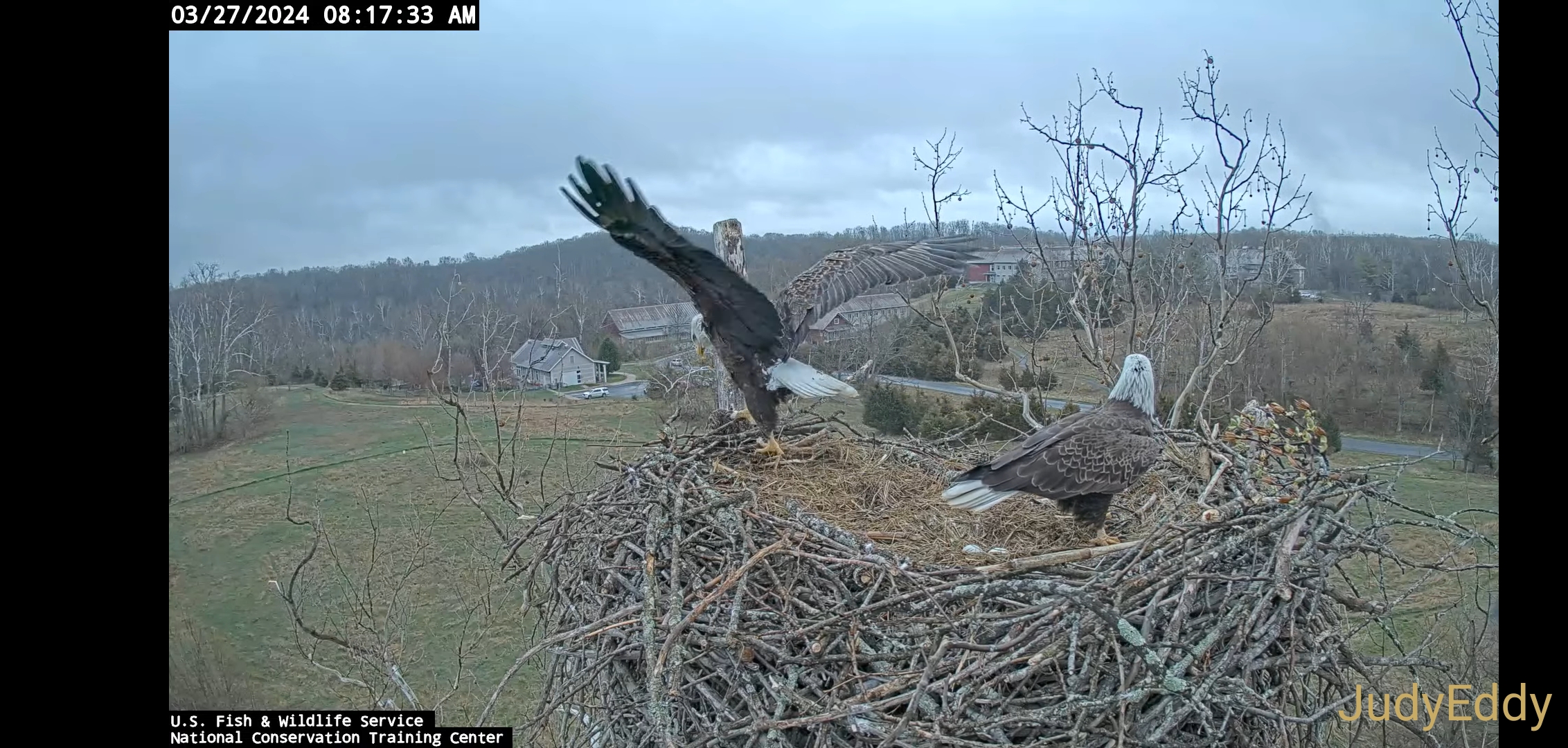 1:08 pm Scout exits the nest. Bella continues to incubate her eggs.