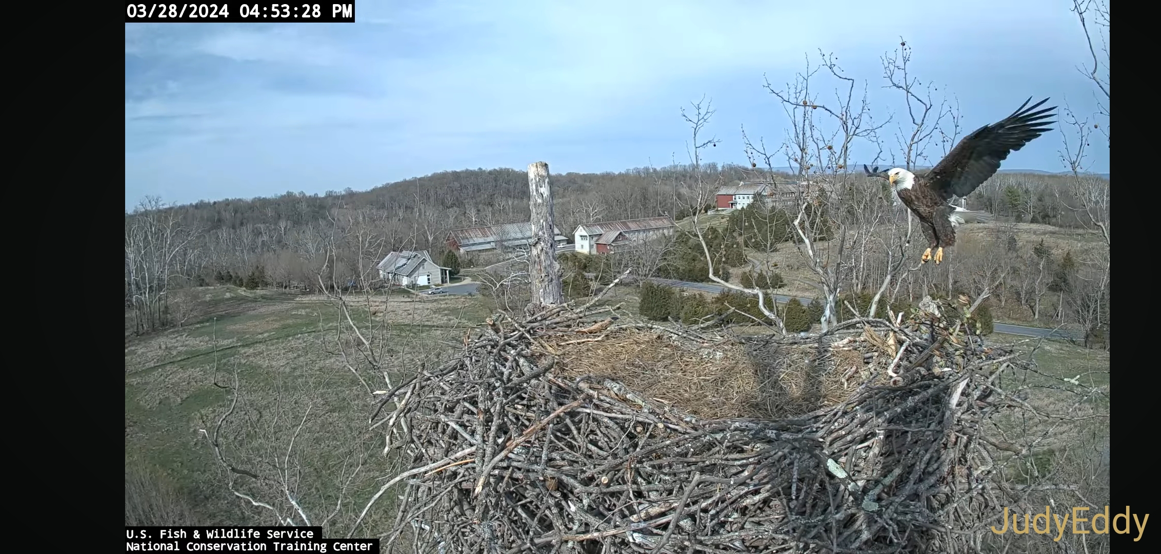 811 am Scout leaves the nest again. Looks like the wind is carrying him away. 812 am you can hear eagle talk. I swear that Bella is cussing out Scout for leaving the nest again. You can see Bella fly underneath the nest on the left hand side. Fly out near the day care in between the group of trees there and the opening before he comes back to the nest. Or while he's coming back to the mess. I did zoom in on it.