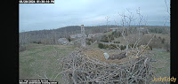 632 am Scout arrives at the nest. 633 am Bella leaves and Scout escorts her out. 634 am Scout returns to incubate. Switch to Scout
