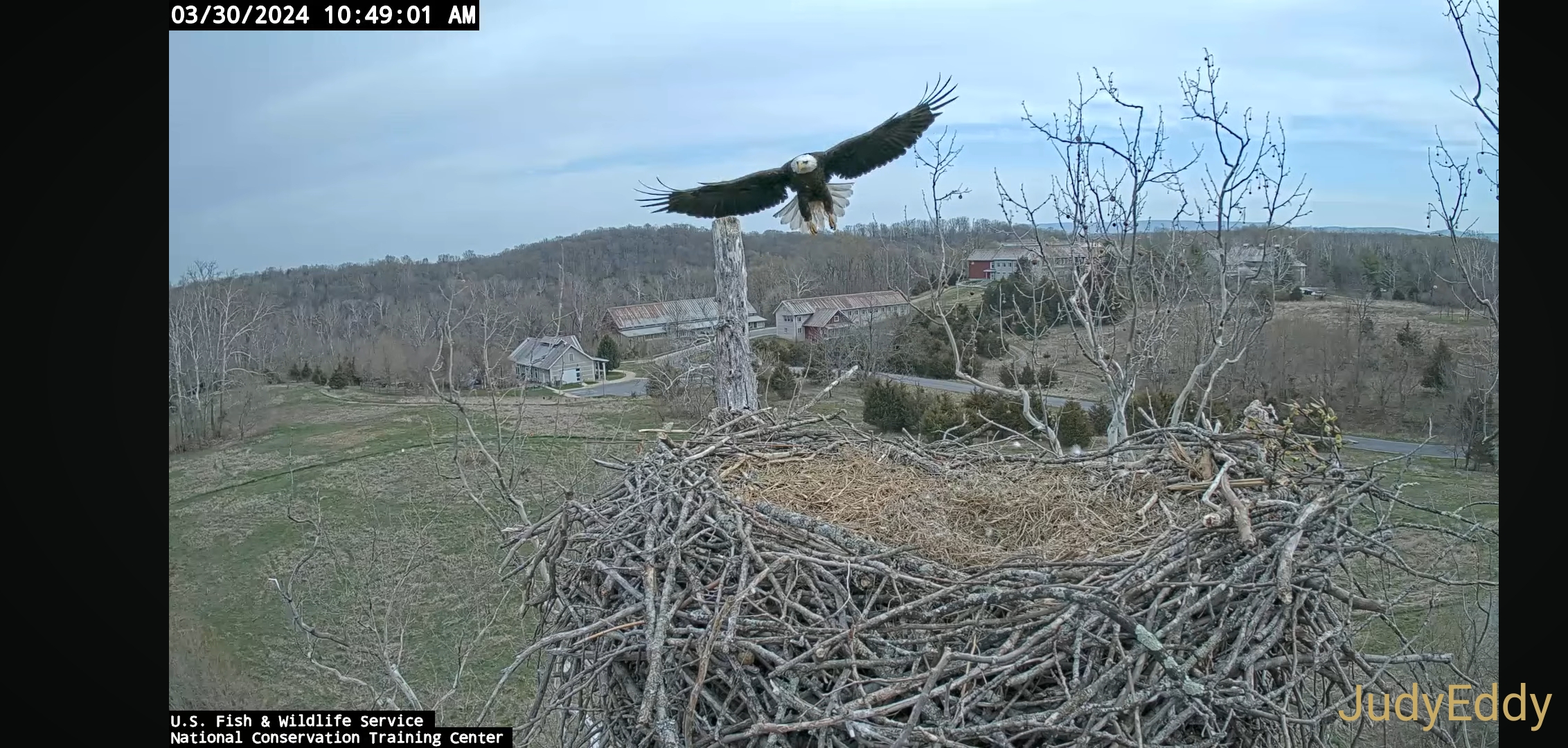 Not for sure what I cannot see any hours or anything.But something is threatening.The nest scout comes to the nest before any chord or any calls.I don't know if he saw something coming to the nest.And that's why I came to the nest but tense moments for our eagle pair