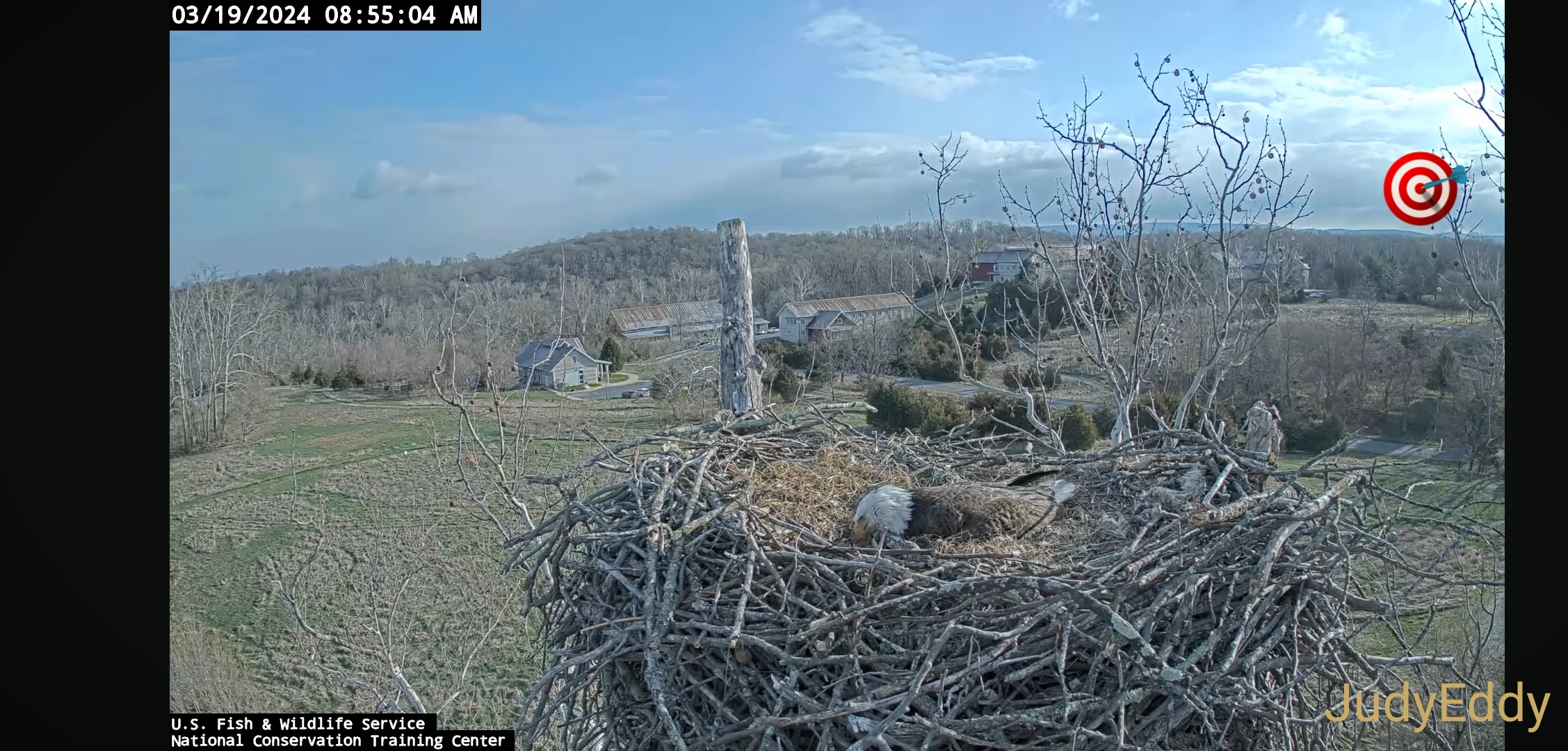 4:54 Bella comes to the nest to incubate and to relieve Scout. a lot of conversation. She lands on the lop chortling back and fourth .......
