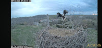 728 am Bella lands with a leafy branch both adults are very vocal back and forth. Could be she is happy for the fish or they see an intruder in the area. No intruder seen on cam but there maybe be someone perched nearby.