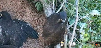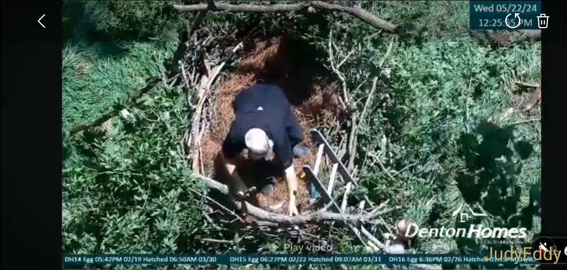 Parent is up in the tree about 70 feet above. The man-made nest in the tree 10 feet off the ground. He just have a score with him waiting for him to drop down if he will. Or not for sure.