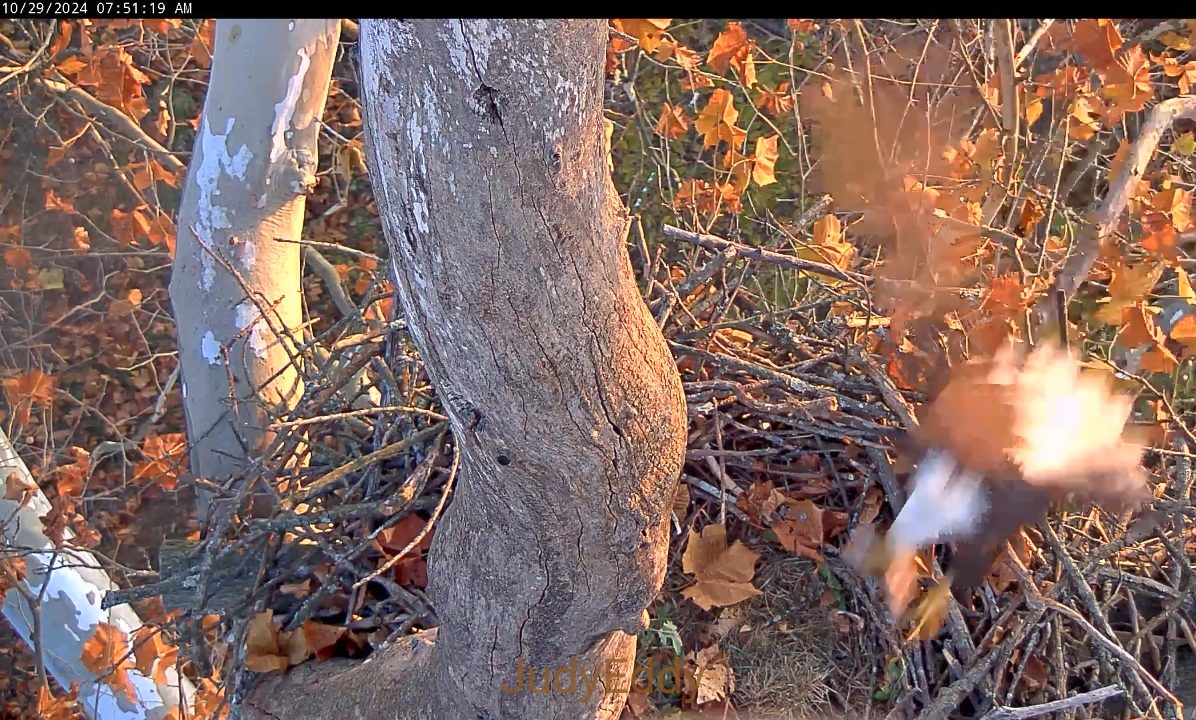 413 pm Scout arrives with a bundle of bedding. Bella joins him at the nest. 417 pm Bella works on the egg cup while Scout perched on th...