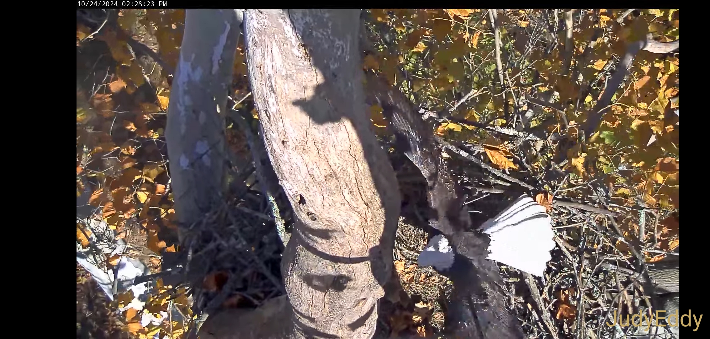 6:37pm Bella flies up to the old nest and catches Scout eating the fish. He moves off and Bella takes over. Correction: Scout did try to take the fish back but not a major food fight. Bella wins.