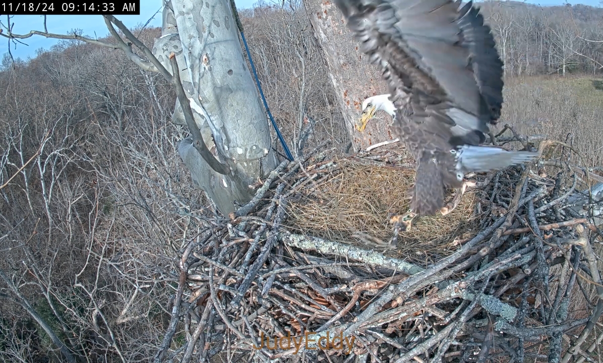 .914 am - NN (new nest) Scout lands with a small branch. He does some restorations.