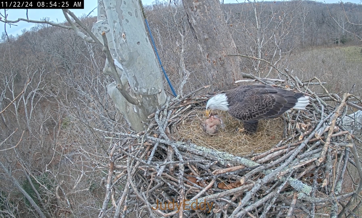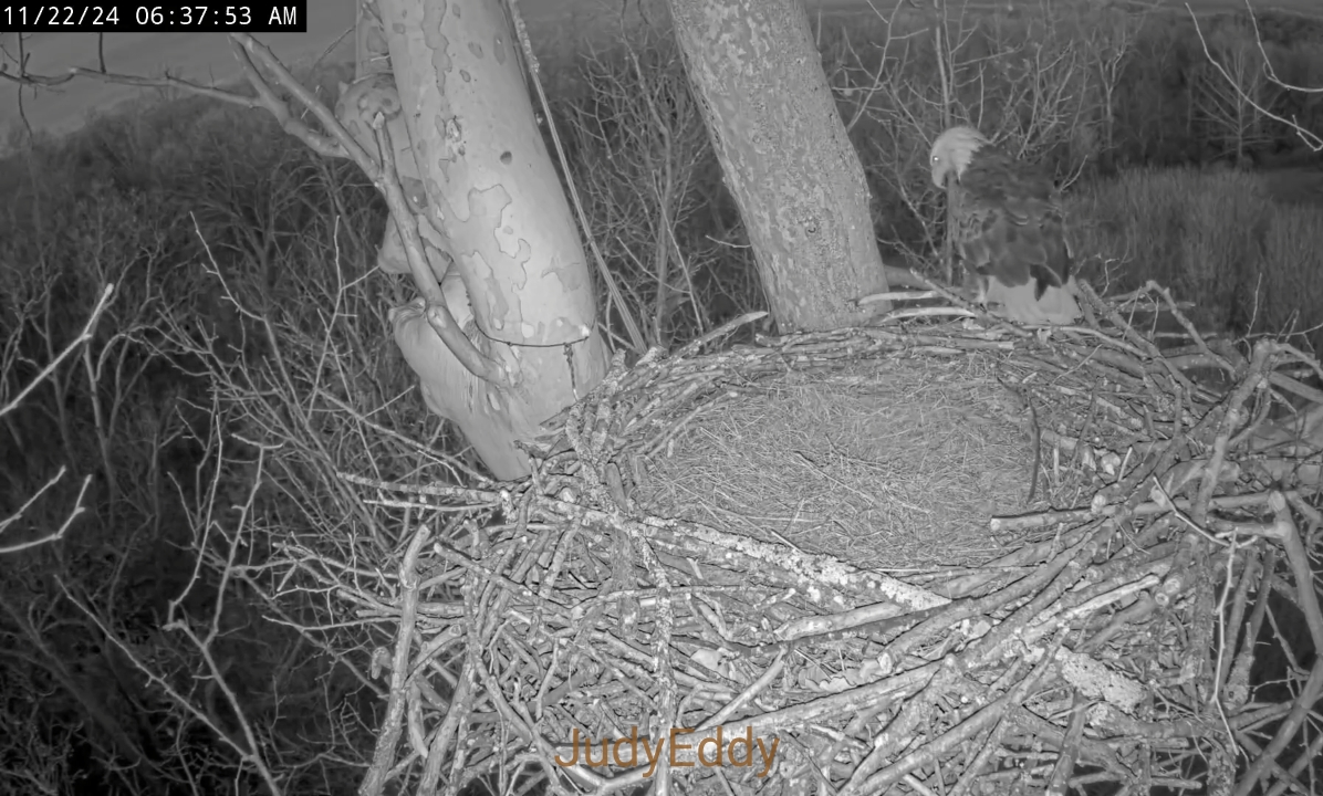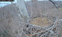633 33 It can be seen at first attempt to land in the nest.Was a little low must have went around and came back in for a second landing six thirty three forty five am Scout flies in the wind is giving him some extra lift this morning. Scout gets down to work, moves some bedding about. He tests the bowl, he is so sweet.