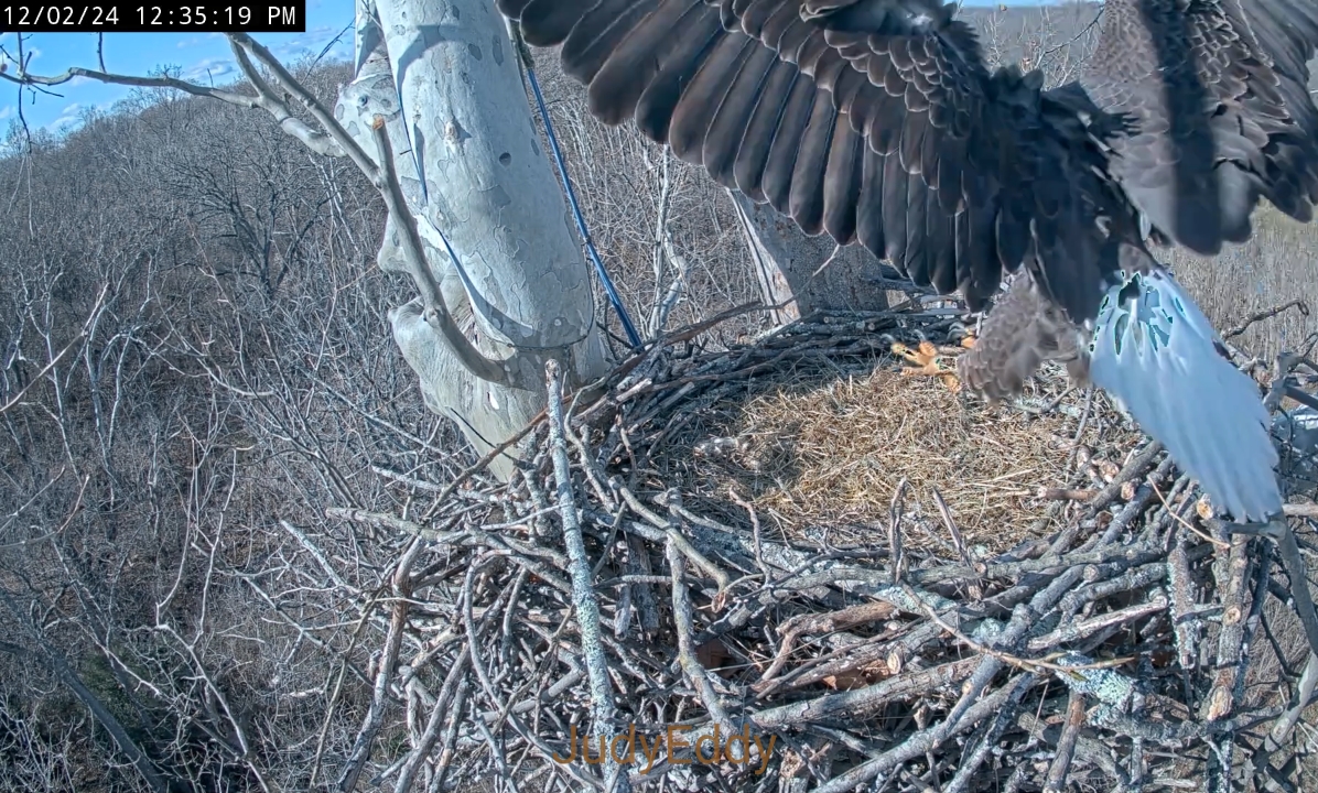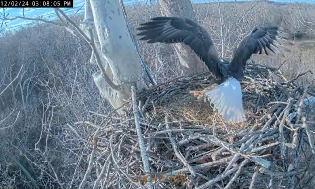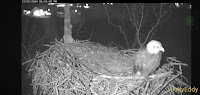 518 pm Intruder lands on the nest. Intruder has dark tipped tail feathers; dark markings on head.Intruder has dark tips on his mostly white tail feathers, back profile.Intruder has some dark feathers on sides of head. Based on plumage he looks to be about 4.5 years old.527 pm - ON - Intruder is testing the bowl.605 pm - Intruder is doing some restortions.