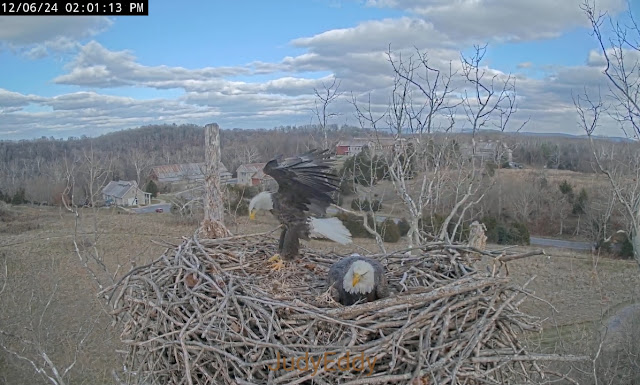 2 PM He comes floating into the nest. On landing he immediately wants to mate. She's down in position already. Maybe did not happen He is focalizing to her.