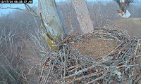 8:46 AM scout enters the nest with the stick. 8:50 AM he exits from the front porch door.