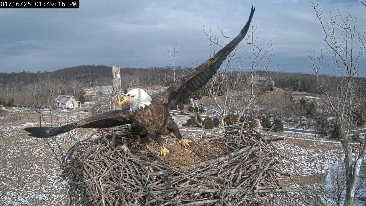 1:41 PM Scout comes to the nest. With a branch and the branch it gets around the back of his head after he lands. He picked up a stick that looked like a wishbone.Had the time of his life trying to place that around the nest I think it took a tour of the nest 3 times traveling stick with 141.He is still trying to place it at 2 Why forty two still messing with the wish bone 1:43 PM.