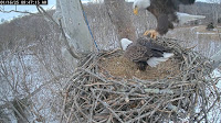 9:46 AM here comes the stick in branch master scout to the nest. Arriving from the forest area. I love it that we can see that area. Be in the fall in the winter during the summer. And we will not be able to see them come in.9:47 AM here comes beautiful bell to the nest flying in from the forest area and she has a big branch in tow The angle she is coming in from the picture. I took looks like she's about ready to stab him LOL J. K. 9:50 a little beaking going over a argument A stick placement at three.9:54 AM scout exist via the front door. 9:54 AM she exists right after him but goes out the front door to the side Stage right.