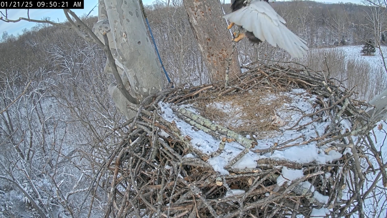 813 am Scout arrives with some bedding for the nest. He spreads it all around. His heard feathers are sticking up this morning. He has his own new mohawk Scout exits the nest and flies to the Daycare Tree. 8:13 AM exits the nest out the front door.816 am - Bella flies in with a branch, She comes in from the side door which they normally don't.What an angle that is that it's pretty cool lots of branches to go through. Scout follows her in. Bella's head feathers are spiked also. Restorations follow.820 big Shake Did both look alike?They had a rough night late night of?¿¿