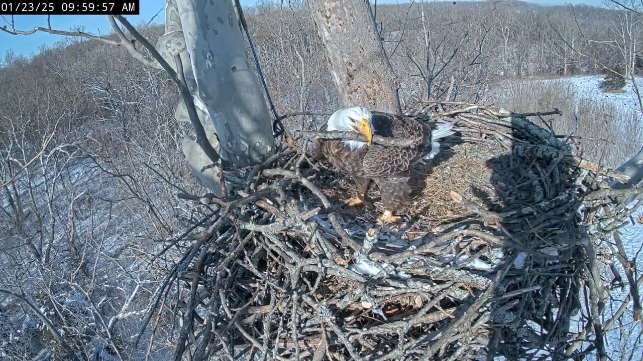 9:50 Bella is in the nest alone.Moving sticks around rearranging the criminals getting to look like a nest again instead of a .Pick me up stick game 9:54 AM he arrives with another Large branch He picks up the branch. She also has ahold of the branch. He is deciding he's going to move it over to the other side of the rail, she still has hold of it. Oh, it almost looks like her neck was gonna turn. He takes control of the branch and moves it over to 7. 9:55 they're both trying to work on the same area as the 2 trunks. 9 56 AM.She exists the nest from the cribrail at the front door.