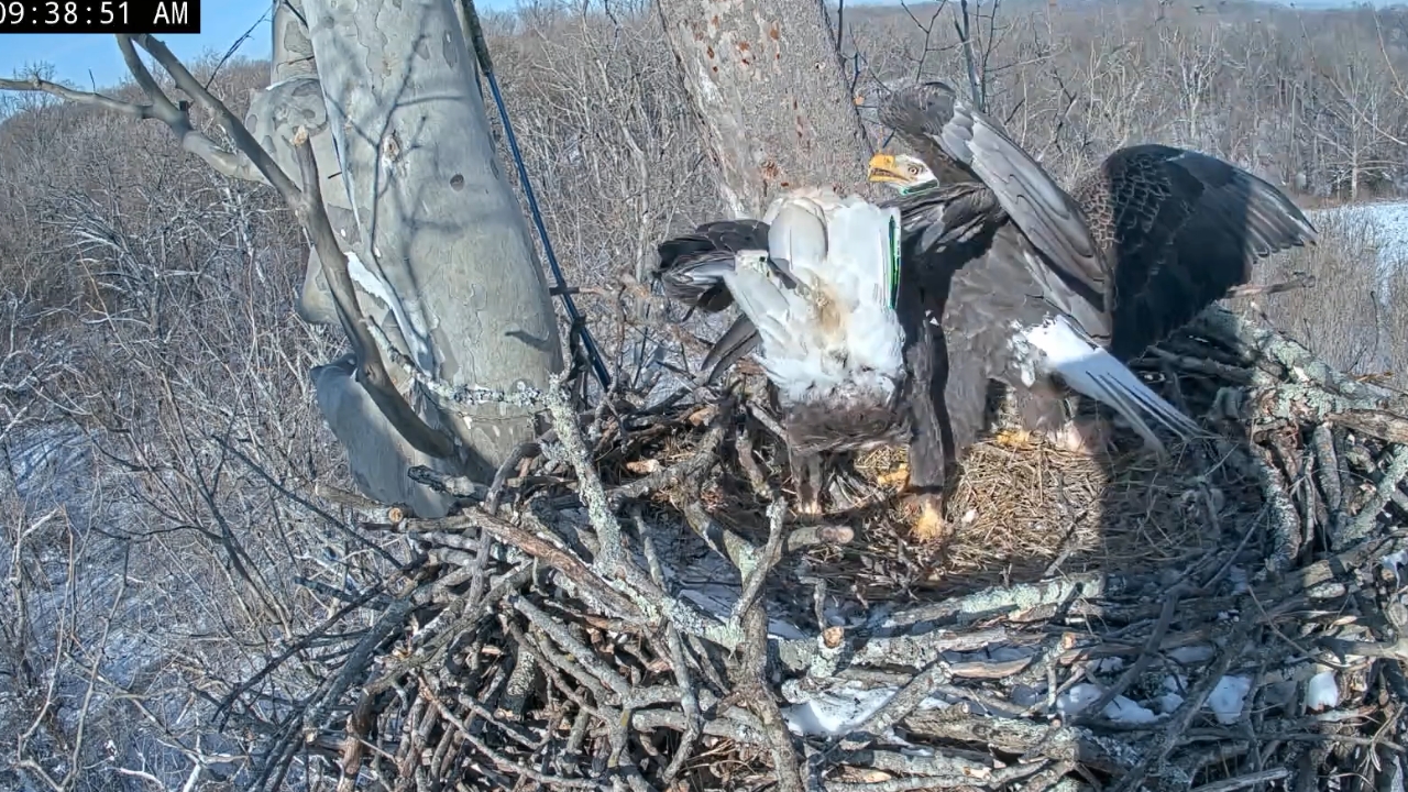 1132 Bella shows up on the scene. And a giant load of bedding she has with her. It was really a close landing on this one , his Head gets underneath her wing as she lands.This nest is way too small. He backs away from the fish Bella takes over eating. 1133 he exits the nest from the front door she remains eating.