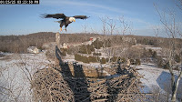 1:03 PM scout comes to the nest with the stick. 1:14 PM Bella joins the scene. 1:20 PM she's tries out the cup. Her head is chest deep into the cup. 121 he was nibbling on her feathers. He wants mating. The sound in command of this be 1:29 PM he exits out the back door toward the camera. 1:29 PM before he arrives a crows or blackbirds. Or whatever they are ravens or squalk in their heads off. 1:33 PM out the side back door. She?