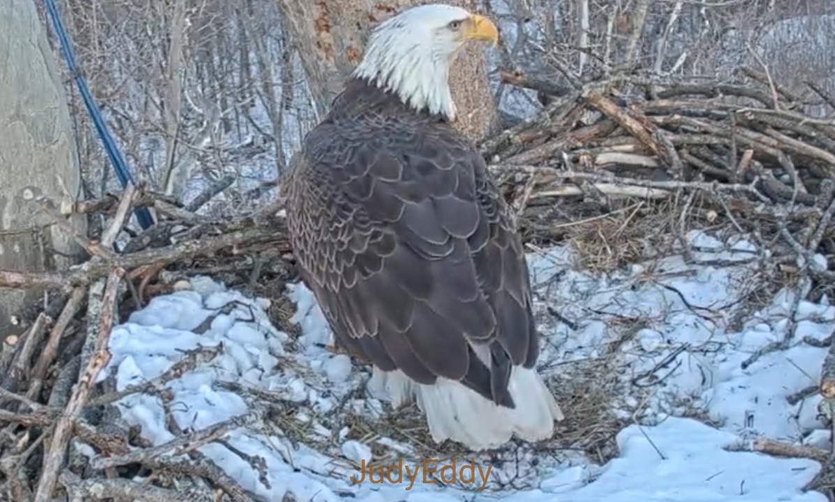 8:29 AM Scout arrives to the nest with a stick in his talons. Just standing around in the nest.