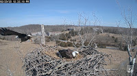 1232 pm Bella lands in the nest. Scout greets her. Bella moves a couple of sticks. Scout does not immediately get up. Scout gets up and off the eggs. Bella eans in to see her eggs and takes over incubating. She gives the eggs a bit of a roll first. Changing of the guard.