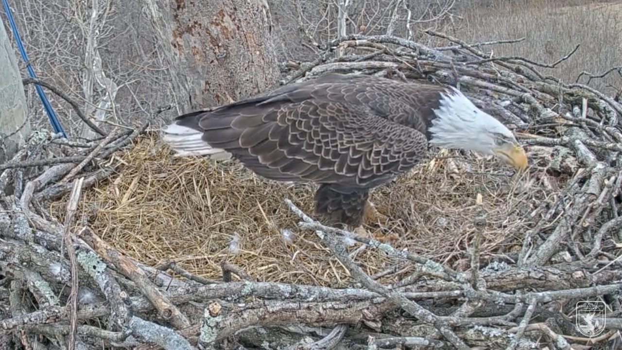 12:36 PM. TL V We return to the nest with a stick. So nice that the wind has calmed down today. He does a lot of desperation, moving the bedding back and fourth, laughing it up.