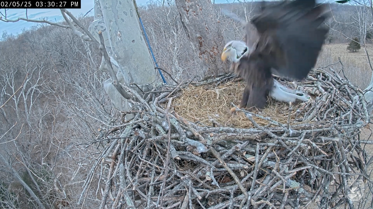 3:53 PM she arrives at the nest with the stick. When she arrives the stick that she has lands on the back of his neck. 355:50a small peep.I'm not for sure out of which one. 3:56:57 PM who's sort of request.Maybe this happily noise.She gets down in front of him. .Does her Talon backward digs breast snuggle down tail up in the cup356, he also goes up to the LO.P 3:57 PM. She is pulling bedding from one side of her to the other side while she's down in the cup. He's on the lop that a big Shruggle at 3:57 PM.3:58 PM down to the nest he goes. 3:59 PM up to the LOP 4:01:11 PM a little bit of squeak out of him again.402 11 Asking for mating, she remains on the lop and he snuggles down in the cup does a little digging.I hope they pick this nest I think everybody does.she goes4:04:38. Also little noise one up on lop and one at the base. 4:06:03 PM. Definitely asking for mating he's on the lop really request. She talks back to him. No, no mating. 4:07 PM. She exits and heads out toward the road.419 talk419 11 /50 420 49422 29/49, 423 20424 10. 42535. 4273942915. 43055, 4:35 PM finally exiting the nest. Gonna go find him to see where dinner is. She's been calling for I'm sure I think.