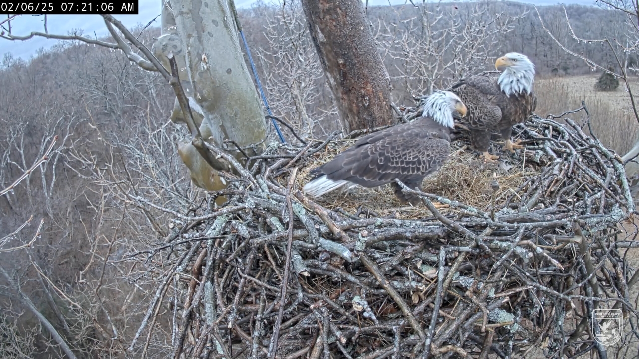 718.53 AM Bella arrives at .NN 7:19 AM Scout joined her in the nest. 7:24 AM she exits the nest From the rail at five toward the camera at the back door. 7 24 28 he exits, but from the base of the nest went out the same door right to the camera.