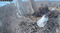 Fg2:42 PM ON Scott arrives with a talon full of bedding. 2:49 PM he exits the nest to the left.