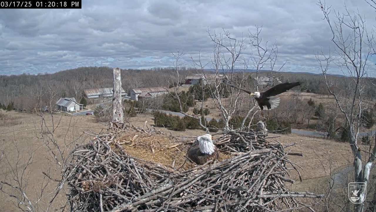 1:20 PM scout arrives to the nest. Bella trumpets from the bowl. She is incubating and waiting for her babes to arrive. I think they're both so eggcited. He came to the nest with what looks like a corn husks and bedding. After he lands, he stands there and just watches the area at the lop base. He walked gently over at the six position. Picks up a stick from the base drops it start turning around. They both look the same way to the right. Something caught their eyes. He begins again, he backs up. Takes a step backwards again. Looking around very diligent, very watchful. Both look at in the same area. Now toward the right. He looks down now at his Talon. She looks down at the nest. Whatever was there is gone he backs up and turns around walk toward the cribrail. 122 She starts puffing herself up. Looks pretty funny then does a nice big shuggle. . 1:23 PM both are very watchful. 1 watching 1 way and one the other. 1:24 PM we get up out of the cup. The wind is really starting to pick up and we exit from the 12 position. He watches her as she leaves.He slowly walks over to the cup and down.He goes on his eggies 1:24 PM COG