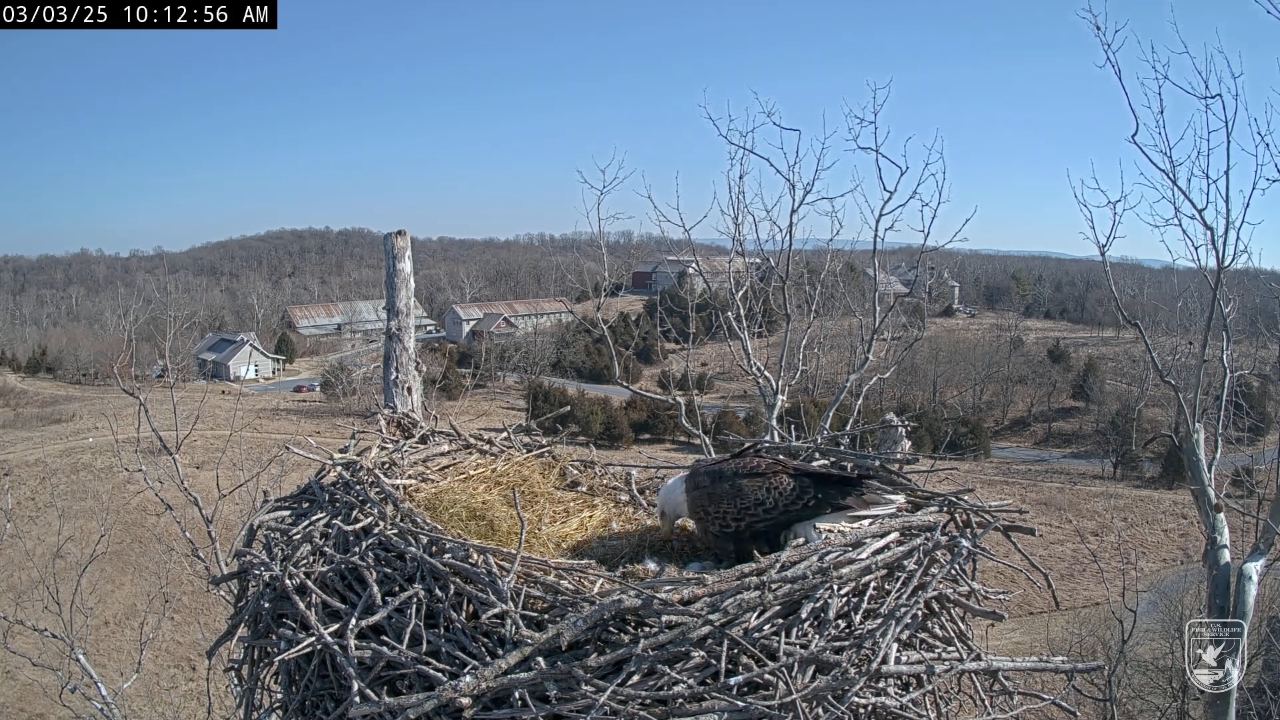 9:19 AM bell returns to the nest. She has a nice load of bedding. It's almost a double load. This way Scout can go out and get more sticks, grass, and maybe a fish gotta get him in practice to bring fish for the babes.