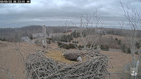 7:04 AM bell returns to the nest.Wow that was a quick break.She enters the nest and you can hear light chortles from him she is grooming. 705 a sharp call was made from him . She starts walking over to where he is very slowly. He does get up right away. She takes over incubation duties again off. He goes toward the really.