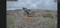 348 pm Bella exits the nest she flies to the grove of pines across the road and lands in one of those trees, likely hunting for squirrel or anything she can find.417 pm Eaglets are curled up asleep in bowl. Hopefully Ma and Pa are finding something to eat.433 pm - Stick arrival no food. Eaglets are expecting food not wood lol. Bella has a blood smear on the sides of her beak. Eaglets are hungry looking for food. E12 has stayed behind at the egg cup. Bella finds an old bone or something and is feeding. Eaglets are eeeechumming at Mom. E10 is showing signs of aggression toward E11, the eaglets are hungry. Hopefully some food comes soon. Bella is frustrated too she vocalizes a few times. Perhaps telling the kids she is sorry there is no food; just try to be patient.441 pm Bella up to the LOP Bella has a mark or abraison on her neck I wonder if she was in an altercation with that adult that flew by the nest earlier. Good grief. 503 pm Scout is perched at the BST. Eaglets are snuggled up together and alone at the nest.522 pm Scout exits the BST and flies to the LOP. The eaglets are peeping at him. Scout calls out a few times. E10 showing aggression, need Bella to return with a nice large fish!529 pm Looks like Bella is back perched nest side no food. Scout is perched on the LOP535 pm - Scout exits from the LOP Bella remains perched nest side just outside of cam view.