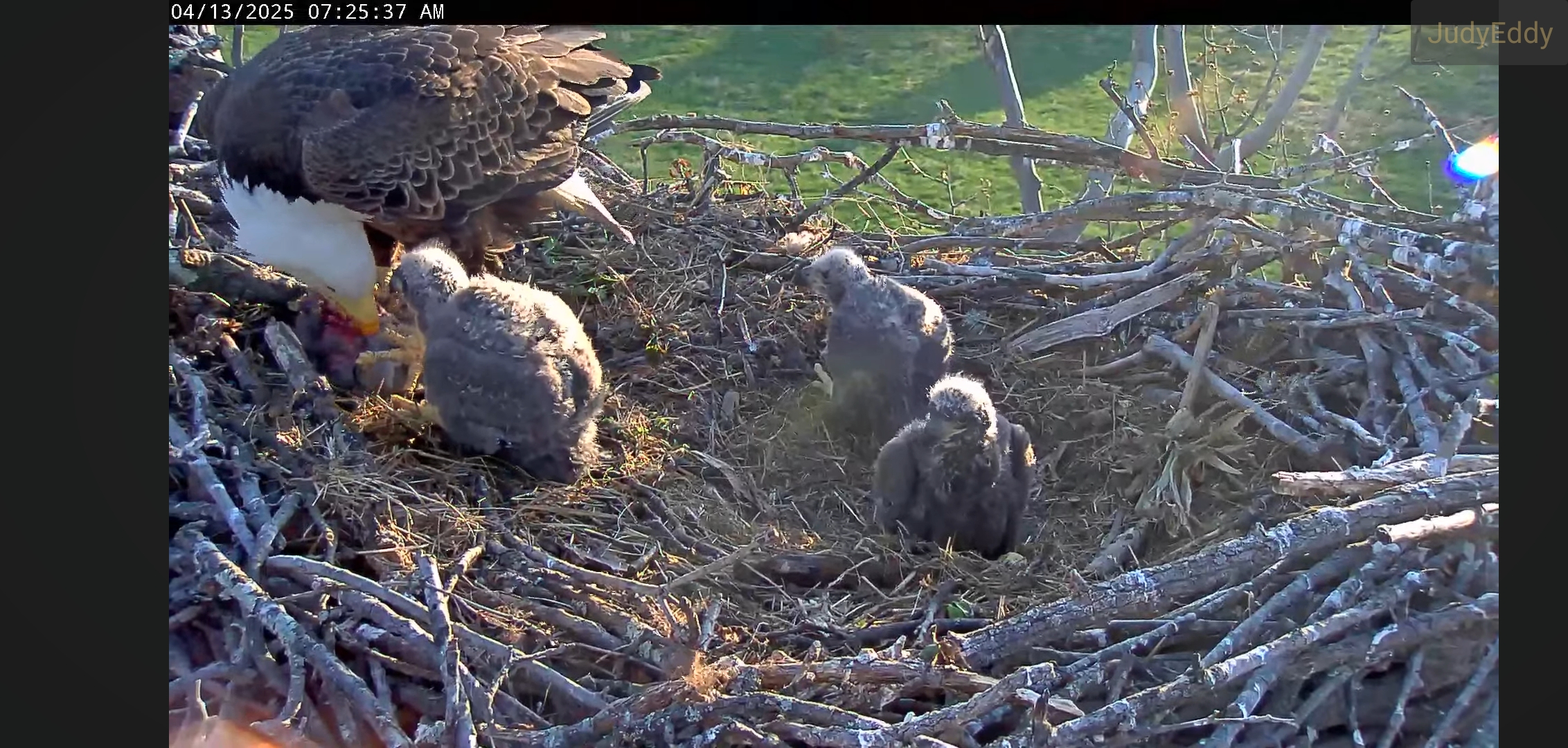 Back to camera 2, he arrives at the original nest and Lands on the lop. He calls for his love Bella to let her know he has food for the children.