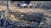 6:36 Scouts in the nest with a big ole fish, alerting between him and Bella back and forth. 6:45 Bella comes down to the nest and claims t...